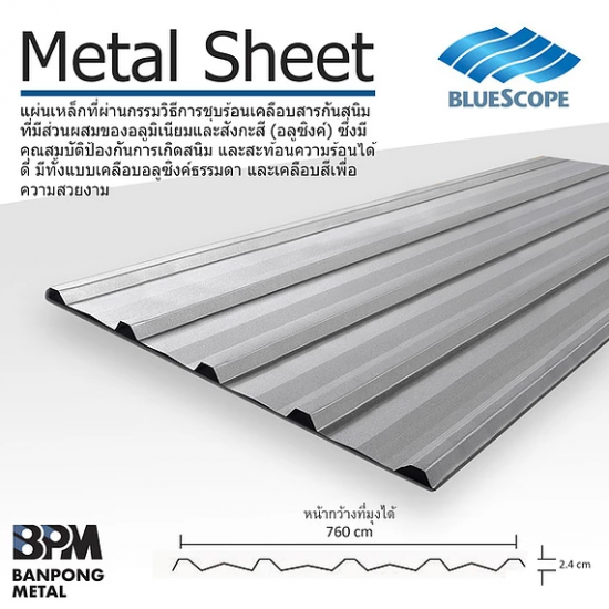 ขนาดความกว้างของแผ่นหลังคาเมทัลชีท760 มิลิลเมตร และบริการรับรีดหลังคาเมทัลชีท ตามความยาวที่ลูกค้าต้องการสั่งตัดได้ คุณสมบัติป้องกันการเกิดมีทั้งแบบเคลือบอลูซิงค์ธรรมดา และแบบเคลือบสีเพื่อความสวยงาม